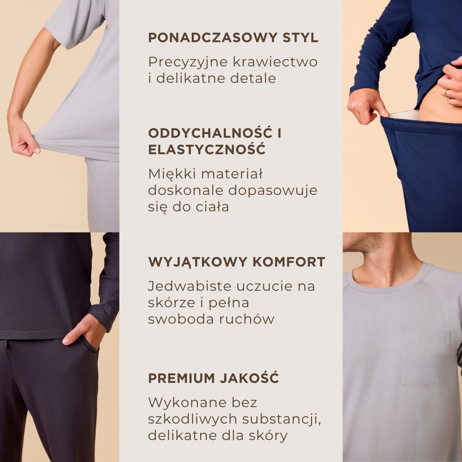 - Harmonia naturalnych materiałów – wiskoza bambusowa i bawełna zapewniają naturalną ochronę antybakteryjną