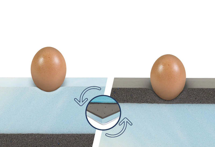 Topper składa się z dwóch warstw pianki o różnej twardości. Po prostu zdejmij pokrowiec i obróć rdzeń. Jeśli wolisz nieco miększą powierzchnię, trzymaj warstwę pianki pamięciowej (czarna warstwa) na górze. Jeśli wolisz nieco twardszą powierzchnię, trzymaj grubszą warstwę pianki poliuretanowej (niebieska warstwa) na górze.